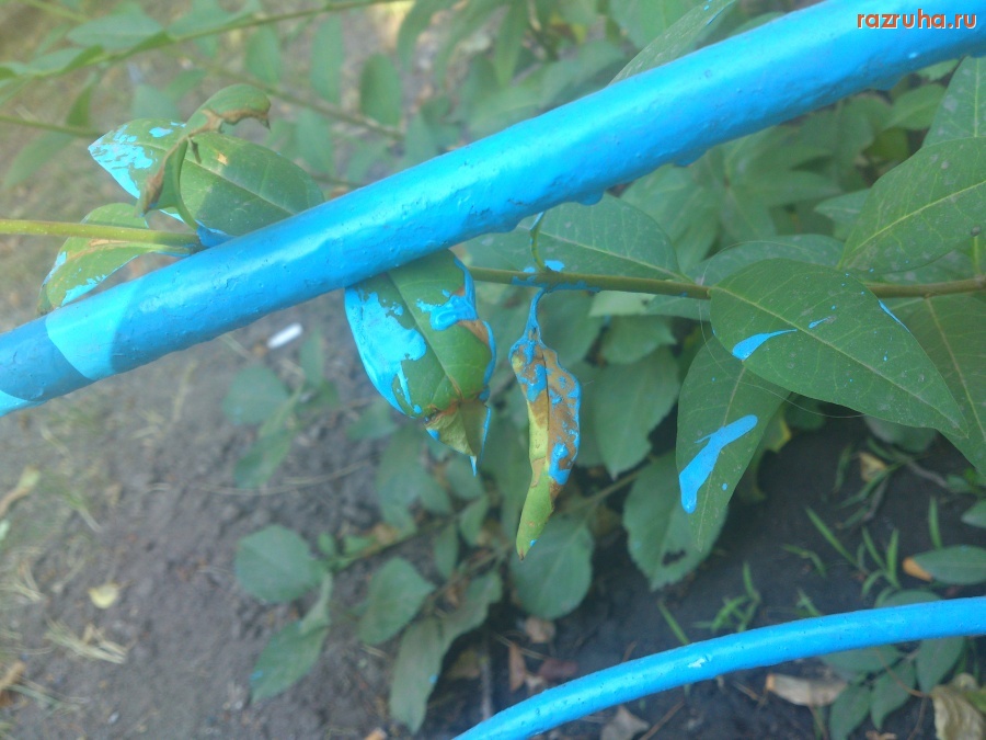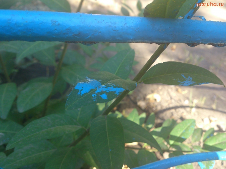 Заборчики у больницы красят вместе с растениями, так быстрее.