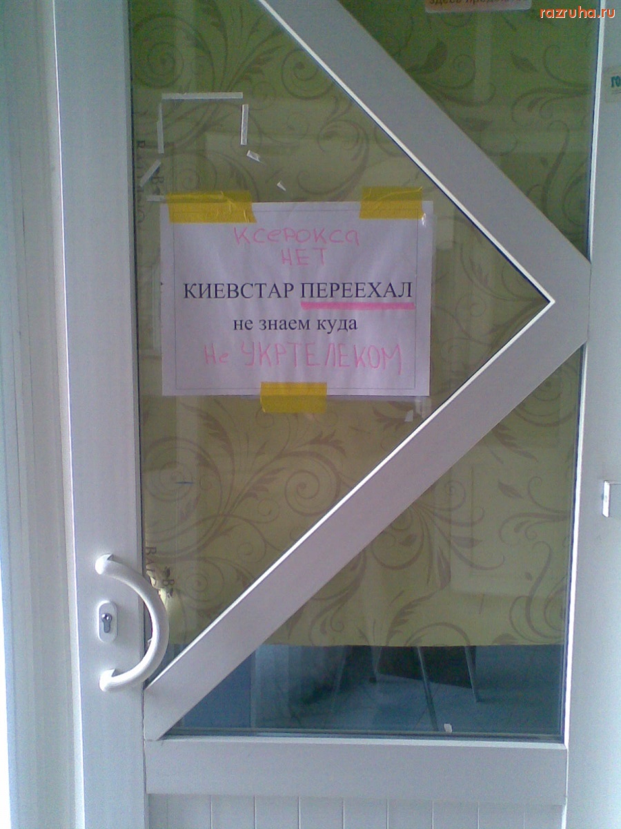 Выше опубликован материал участника фотохостинга Разруха.орг по имени Alexdmm. Фотография называется Крик души: "Киевстар переехал - не знаем куда"; Вы же, в свою очередь, можете предложить альтернативное название для данной публикации (это можно сделать в виде комментария, используя соответствующую форму под фото).