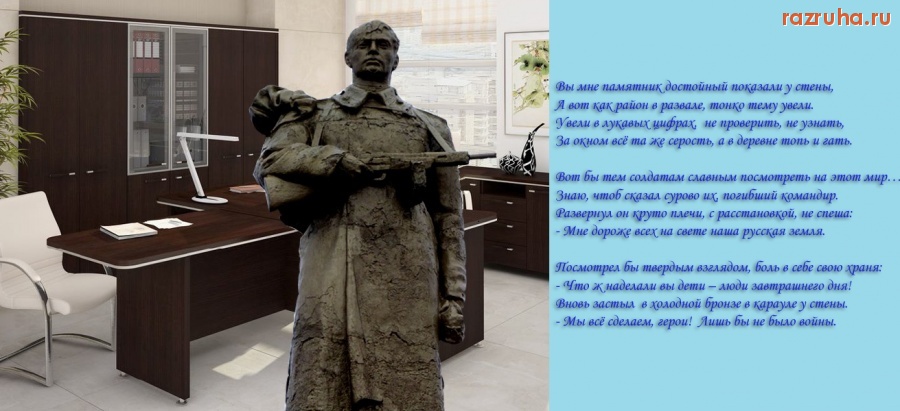 г-н Некипелов полтора часа пытался меня оглушить цифрами успехов по району. Не смог убедить. В конце концов он подвел меня к макету памятника из бронзы воинам Великой Отечественной. И сказал, что его установят к 9 мая 2014 г. И это было единственным значимым делом, что он сделал за 5 лет. И больше ничего. Вот.