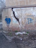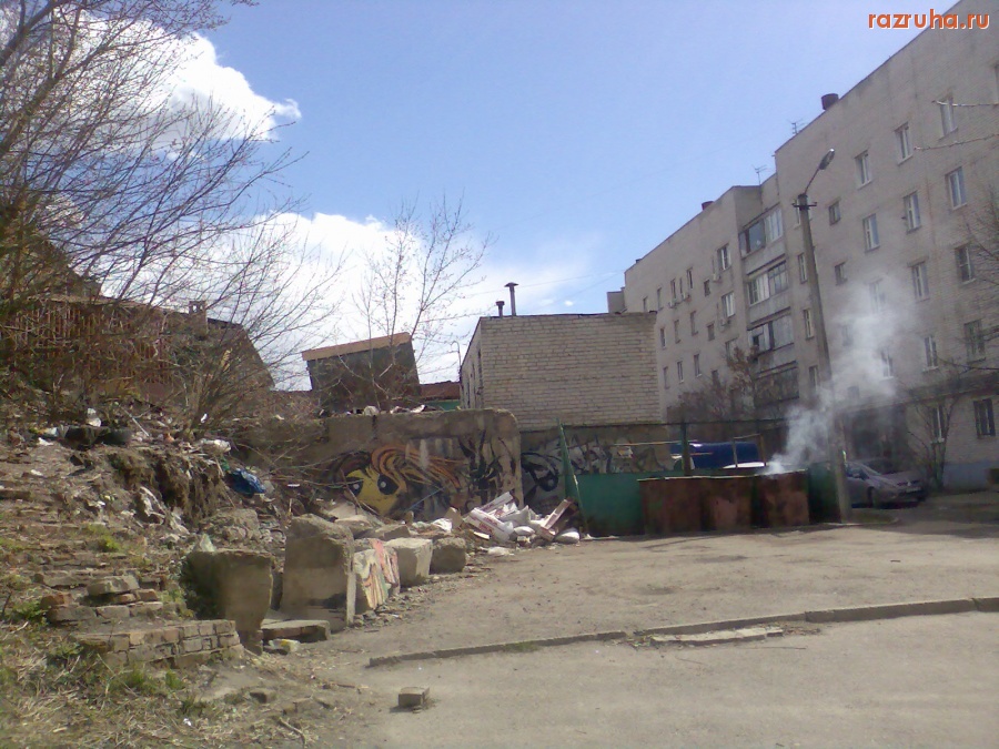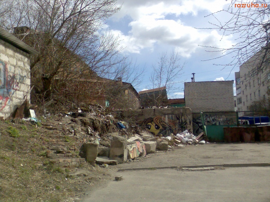 Дом возле Центрального рынка. По ту сторону дома рынок, а тут тишина и безлюдье, мало кто ходит и видит, что тут делается. Дорога возле дома в ямах, помойка с кучей мусора, стенка, поддерживающая склон, обвалилась, ещё заброшенный кривой сортир.