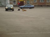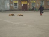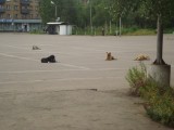 Описание: Псы отдыхают на площади Комсомольская на проезжей части.